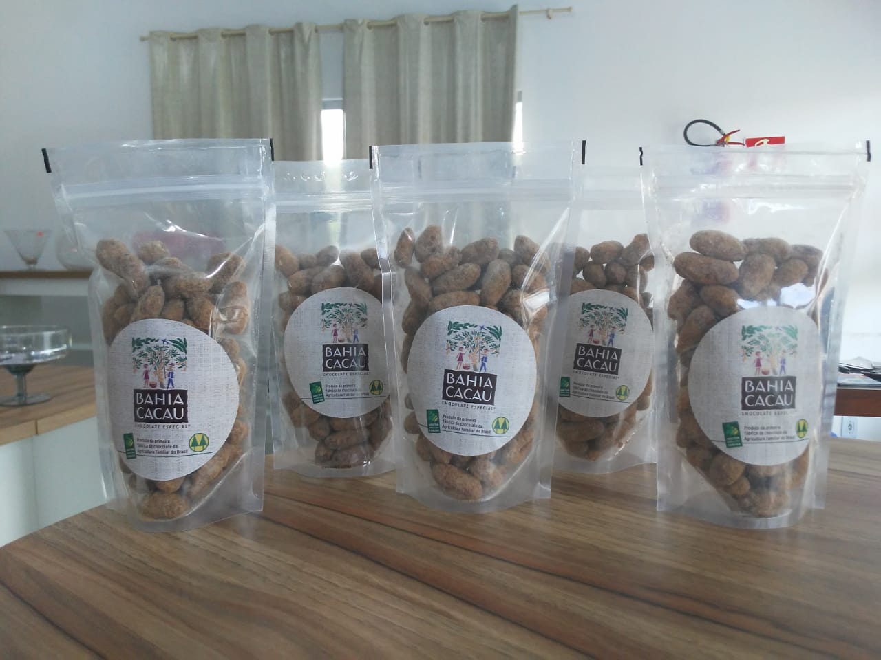 CAIXA COM 30 PACOTES DE 100 GRAMAS DE AMÊNDOAS CACAU CARAMELIZADAS
