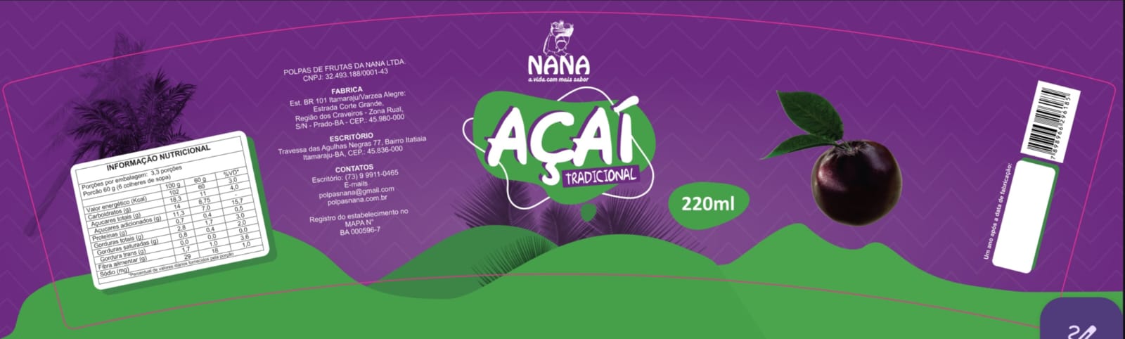 | História | CREME DE AÇAÍ, PRODUZIDO POR AGRICULTORES FAMILIARES DO MUNICIPIO DE PRADO, NO ASENTATMENTO SÃO FRANCISCO NA REGIÃO DO CRAVEIRO, NA AGROINDUSTRIA FAMILIAR, POLPAS DE FRUTAS DA NANA LTDA-ME, PRODUTO COM O MAIS PURO AÇAÍ DA REGIÃO EXTRMO SUL DA BAHIA, TRAZENDO FRESCOR E ENERGIA A SEUS ADPTOS. |