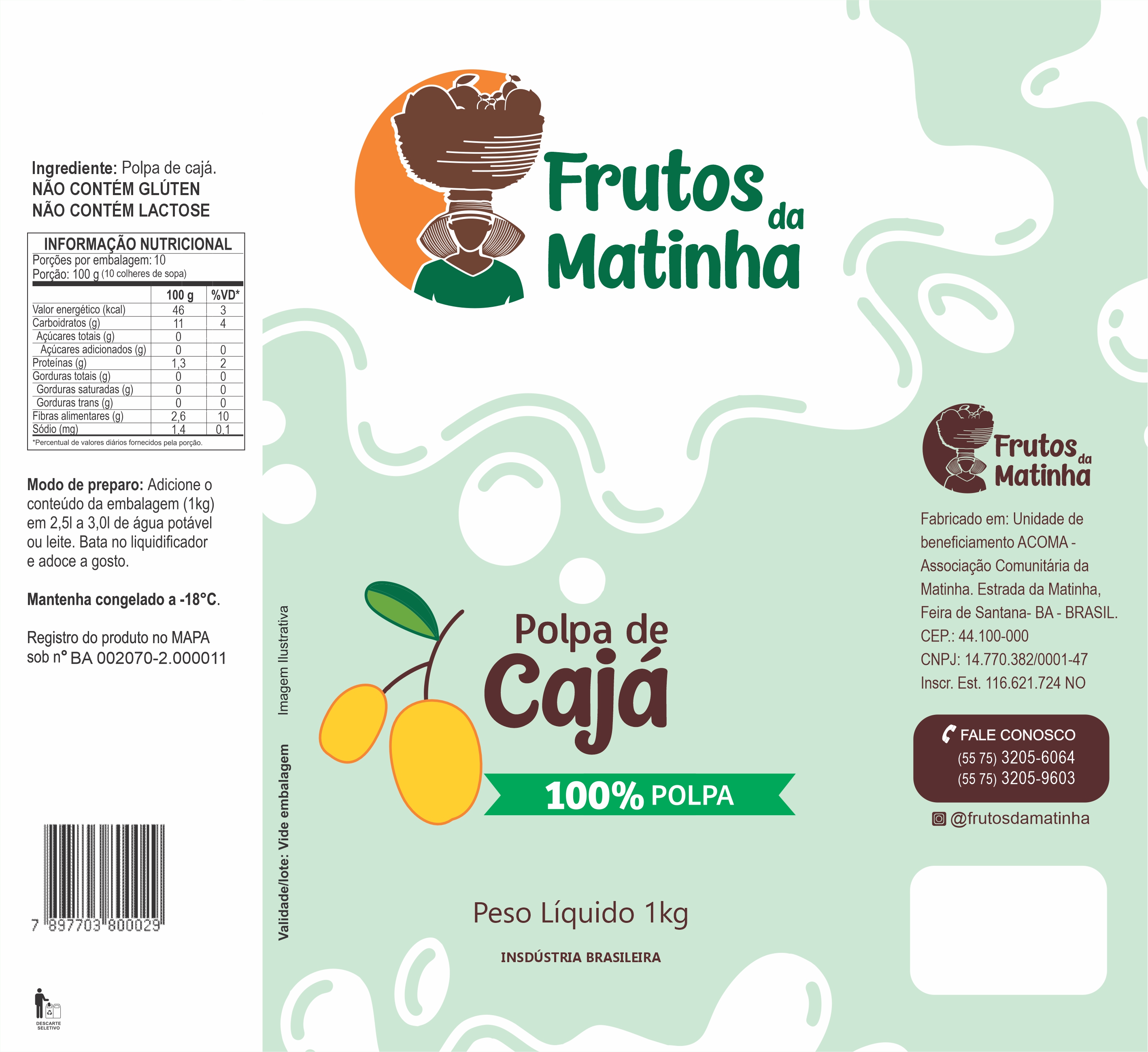 | História | A Associação Comunitária de Matinha (ACOMA), é situada no Distrito da Matinha, comunidade quilombola, em Feira de Santana, Bahia. Uma Associação, formada basicamente por mulheres, com origem na agricultura familiar, que trabalham em favor da coletividade. Iniciamos nossas atividades em 1971, com desenvolvimento de diversos trabalhos de natureza comunitária e coletiva: projetos sociais, projetos produtivos, roça comunitária e casa de farinha comunitária. A Associação se envolve na resolução dos problemas da comunidade e na criação de alternativa de geração de trabalho e geração de renda. Produzimos, atualmente, Polpas de Frutas Regionais e Artesanais, 100% natural. |