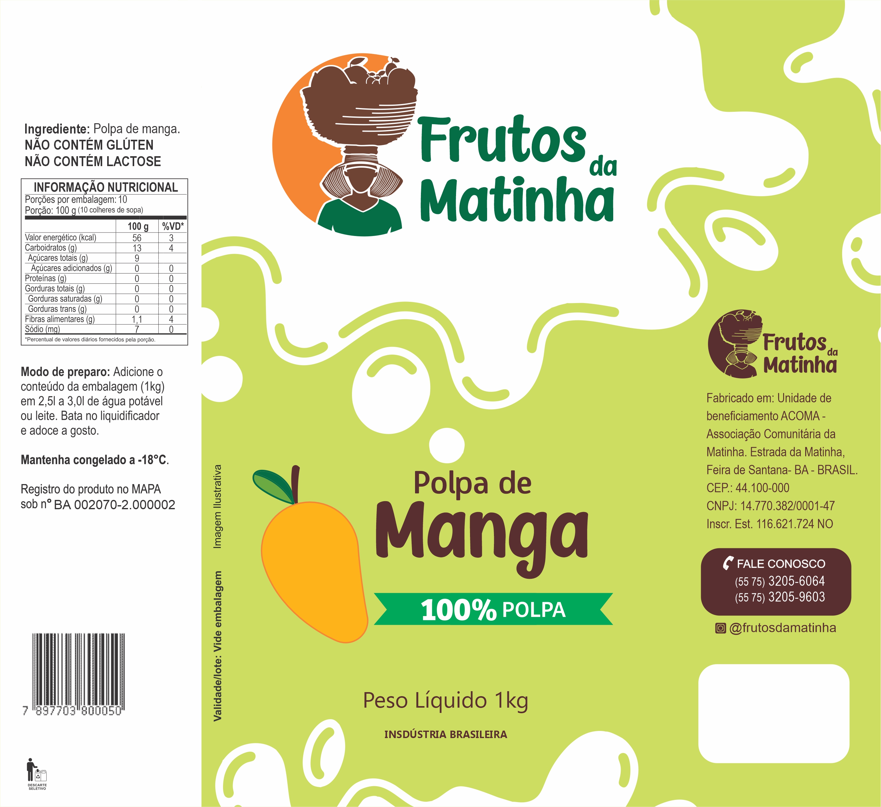 | História | A Associação Comunitária de Matinha (ACOMA), é situada no Distrito da Matinha, comunidade quilombola, em Feira de Santana, Bahia. Uma Associação, formada basicamente por mulheres, com origem na agricultura familiar, que trabalham em favor da coletividade. Iniciamos nossas atividades em 1971, com desenvolvimento de diversos trabalhos de natureza comunitária e coletiva: projetos sociais, projetos produtivos, roça comunitária e casa de farinha comunitária. A Associação se envolve na resolução dos problemas da comunidade e na criação de alternativa de geração de trabalho e geração de renda. Produzimos, atualmente, Polpas de Frutas Regionais e Artesanais, 100% natural. |
