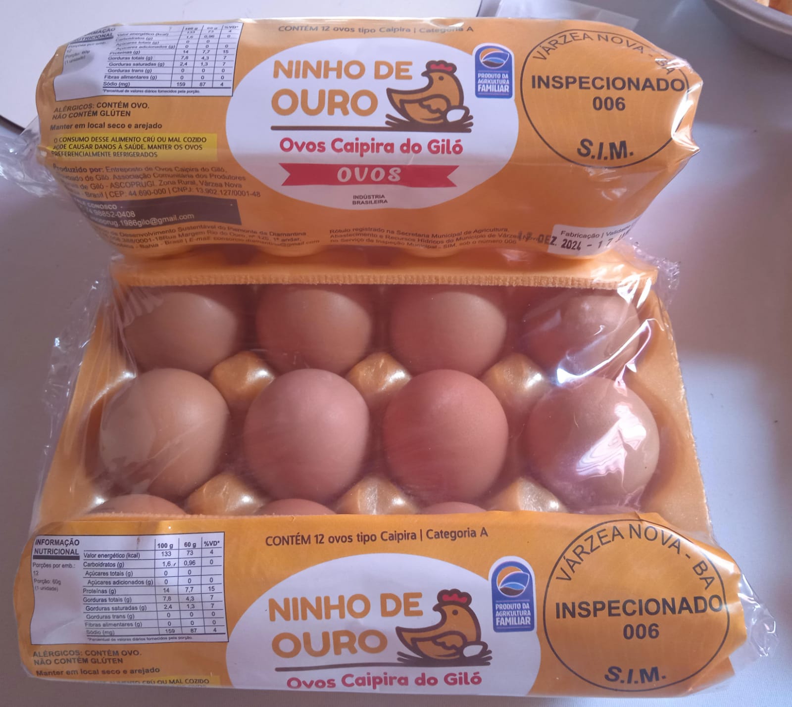 | História | Os ovos Caipira Ninho de Ouro do Giló, Várzea Nova Bahia - produzidos direto do coração do sertão baiano, com cuidado, responsabilidade e o carinho da agricultura familiar. Galinhas criadas soltas e alimentadas de forma natural, garantem ovos de qualidade superior com gema mais firme e sabor de verdade! Produção sustentável, bem-estar animal, resumindo em: tradição, sabor e saúde na sua mesa |